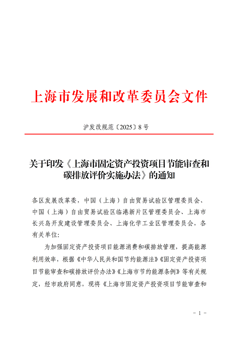关于印发《上海市固定资产投资项目节能审查和碳排放评价实施办法》的通知 (发布日期:2025年10月31日 文号:沪发改规范〔2025〕8号)