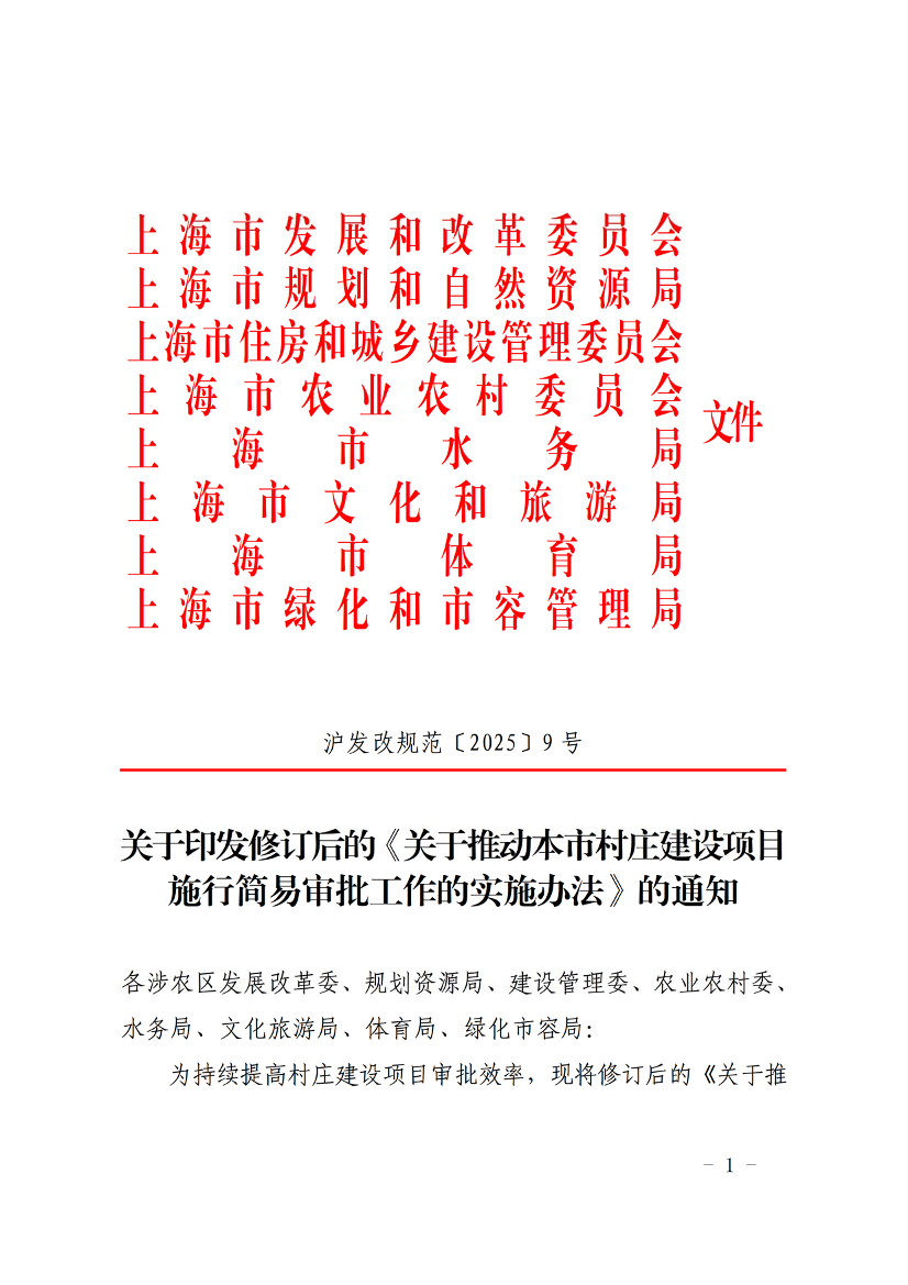 关于印发修订后的《关于推动本市村庄建设项目施行简易审批工作的实施办法》的通知 (发布日期:2025年11月10日 文号:沪发改规范〔2025〕9号)
