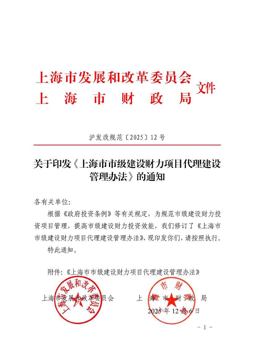 关于印发《上海市市级建设财力项目代理建设管理办法》的通知 (发布日期:2025年12月09日 文号:沪发改规范〔2025〕12号)