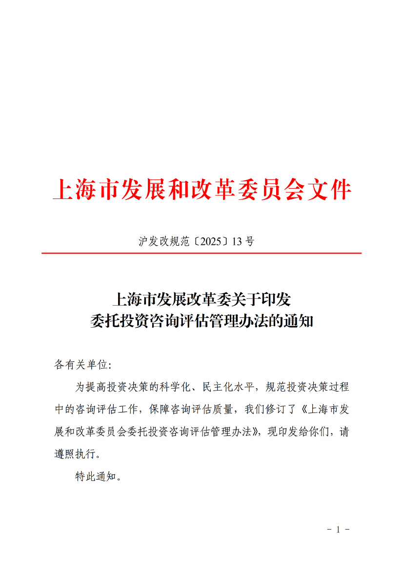 上海市发展改革委关于印发委托投资咨询评估管理办法的通知 (发布日期:2025年12月17日 文号:沪发改规范〔2025〕13号)