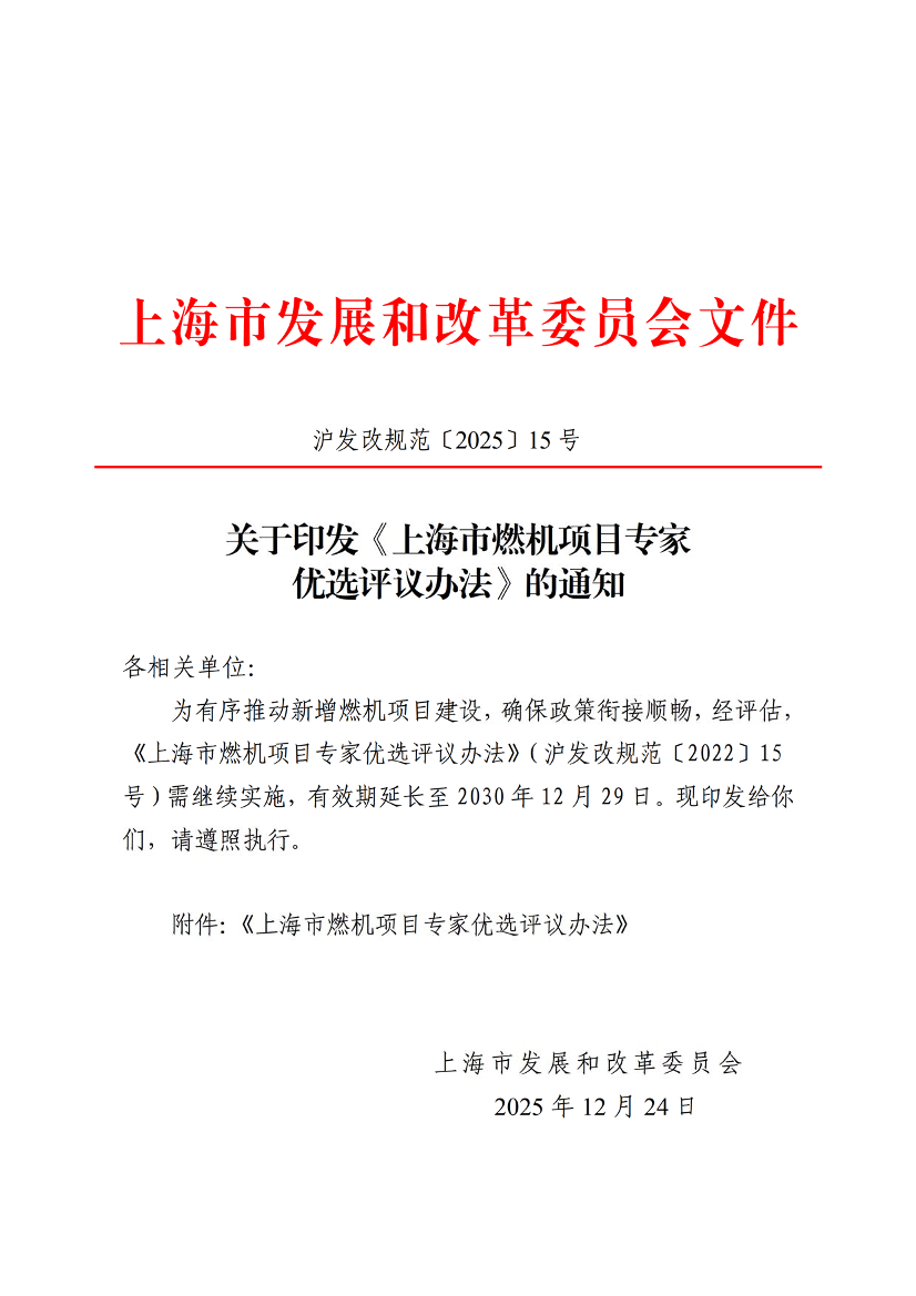 关于印发《上海市燃机项目专家优选评议办法》的通知 (发布日期:2025年12月26日 文号:沪发改规范〔2025〕15号)
