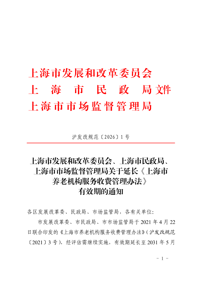 上海市发展和改革委员会、上海市民政局、上海市市场监督管理局关于延长《上海市养老机构服务收费管理办法》有效期的通知 (发布日期:2026年02月04日 文号:沪发改规范〔2026〕1号)