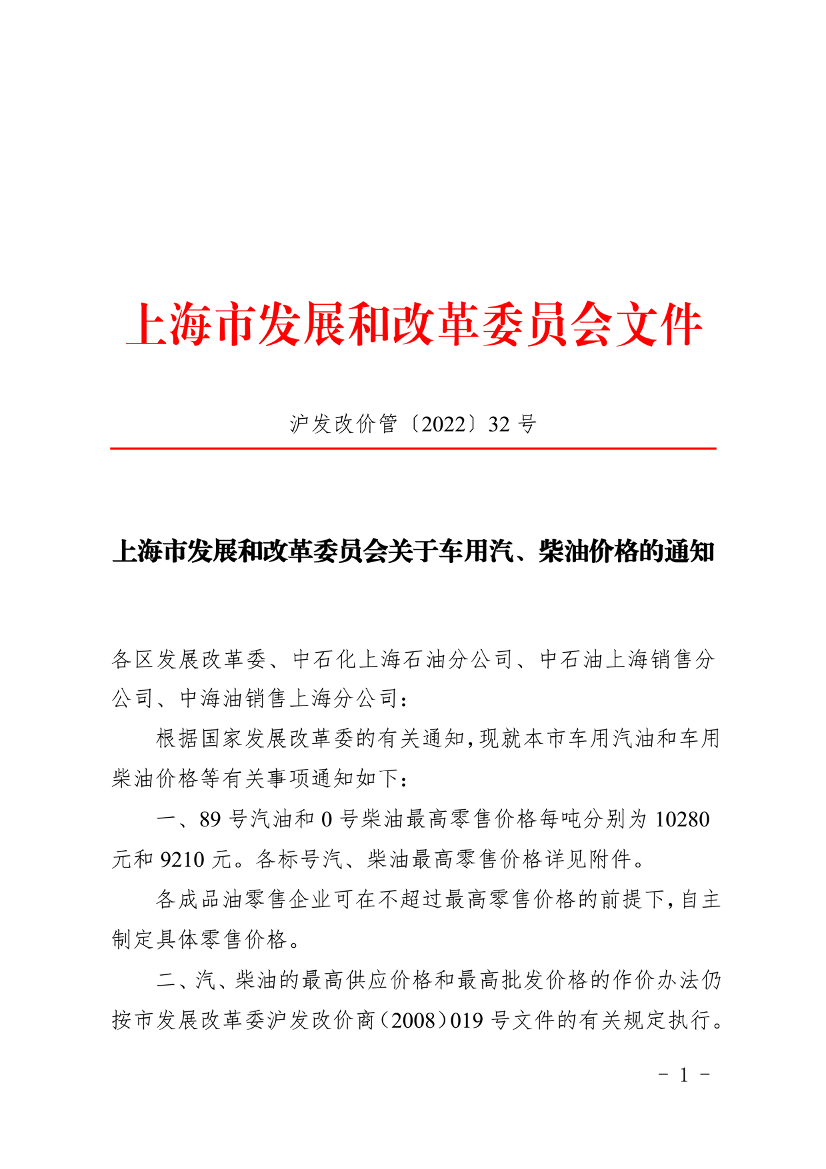 上海市发展和改革委员会关于车用汽、柴油价格的通知(2022年8月23日) (发布日期:2022年08月23日 文号:沪发改价管〔2022〕32号)