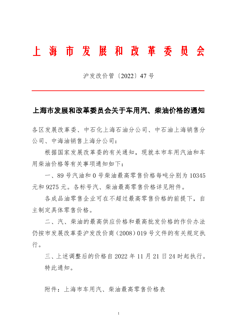 上海市发展和改革委员会关于车用汽、柴油价格的通知(2022年11月21日) (发布日期:2022年11月21日 文号:沪发改价管〔2022〕47号)
