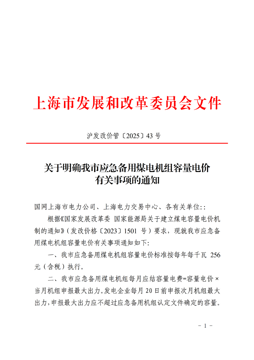 关于明确我市应急备用煤电机组容量电价有关事项的通知 (发布日期:2025年11月17日 文号:沪发改价管〔2025〕43号)