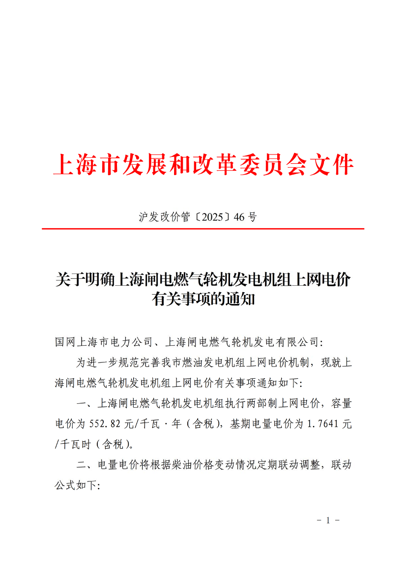 关于明确上海闸电燃气轮机发电机组上网电价有关事项的通知 (发布日期:2025年12月04日 文号:沪发改价管〔2025〕46号)