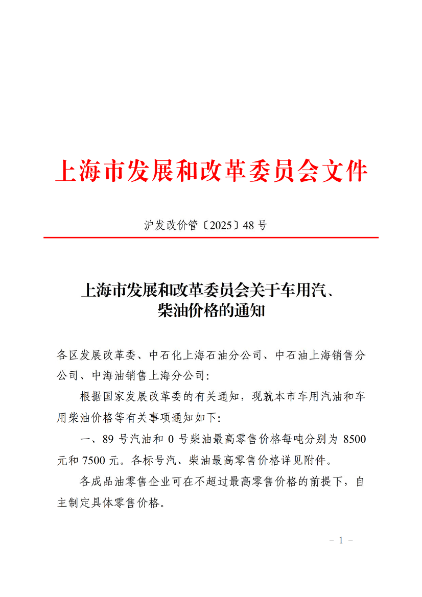 上海市发展和改革委员会关于车用汽、柴油价格的通知(2025年12月8日) (发布日期:2025年12月08日 文号:沪发改价管〔2025〕48号)