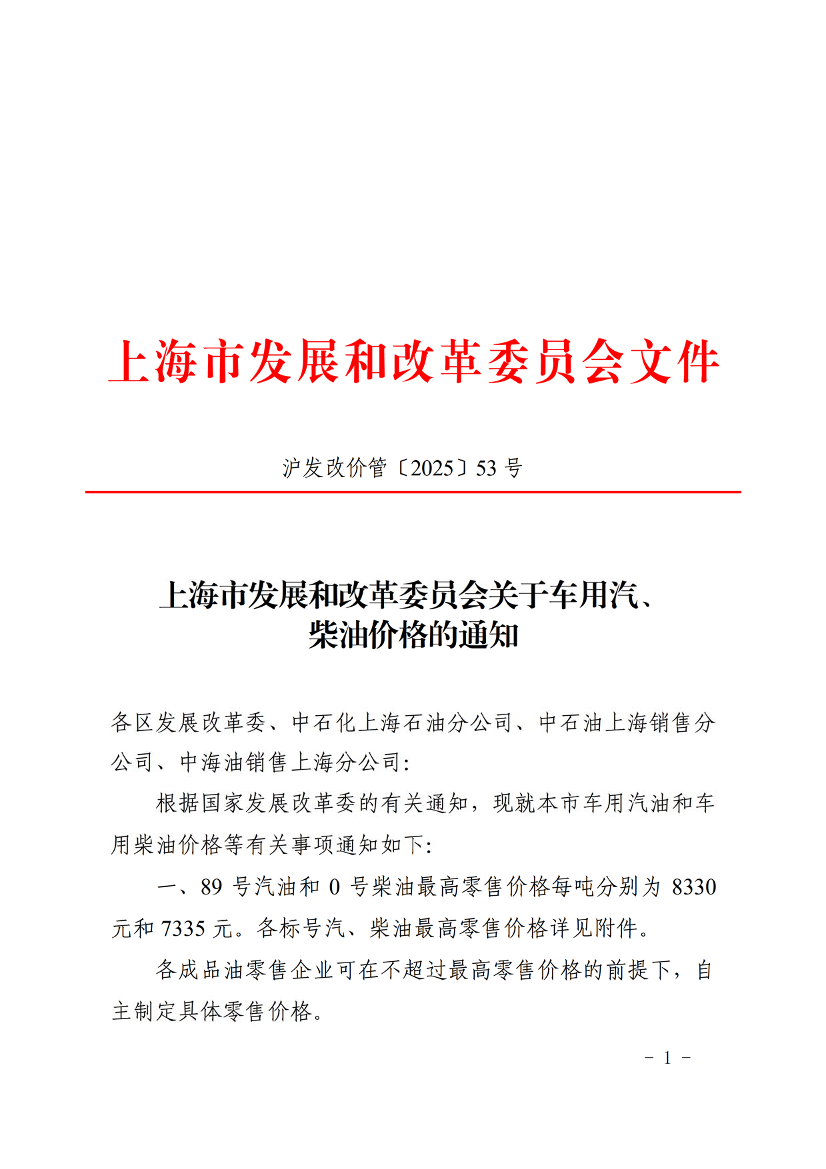 上海市发展和改革委员会关于车用汽、柴油价格的通知(2025年12月22日) (发布日期:2025年12月22日 文号:沪发改价管〔2025〕53号)