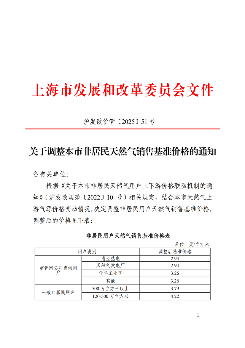 关于调整本市非居民天然气销售基准价格的通知 (发布日期:2025年12月24日 文号:沪发改价管〔2025〕51号)