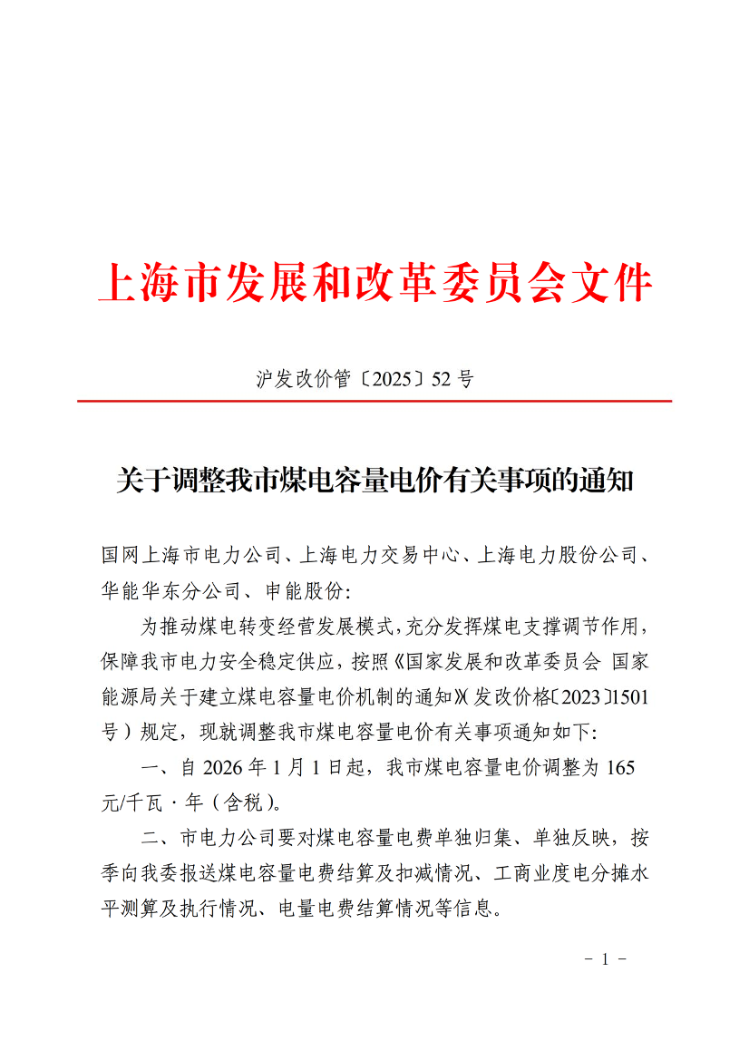 关于调整我市煤电容量电价有关事项的通知 (发布日期:2025年12月24日 文号:沪发改价管〔2025〕52号)