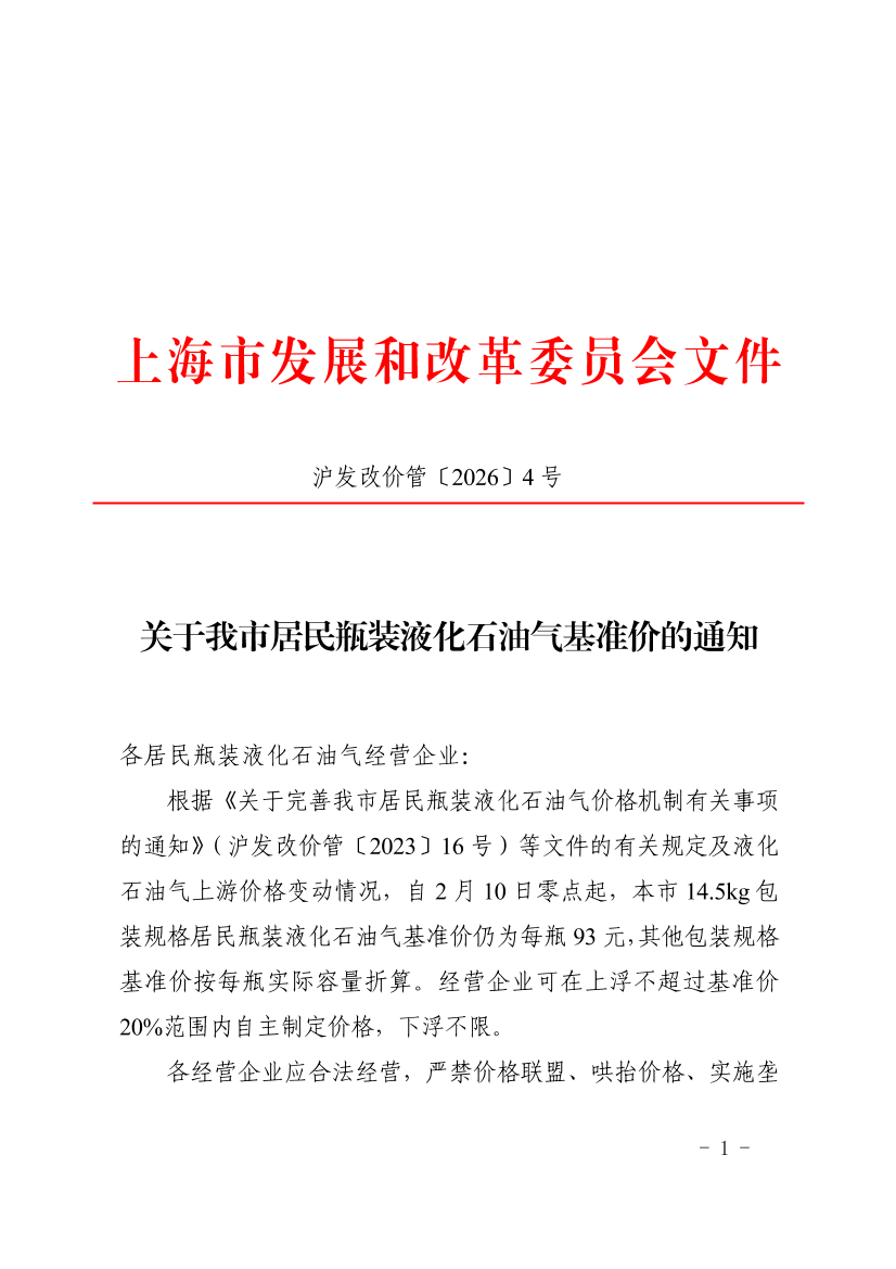 关于我市居民瓶装液化石油气基准价的通知 (发布日期:2026年02月09日 文号:沪发改价管〔2026〕4号)