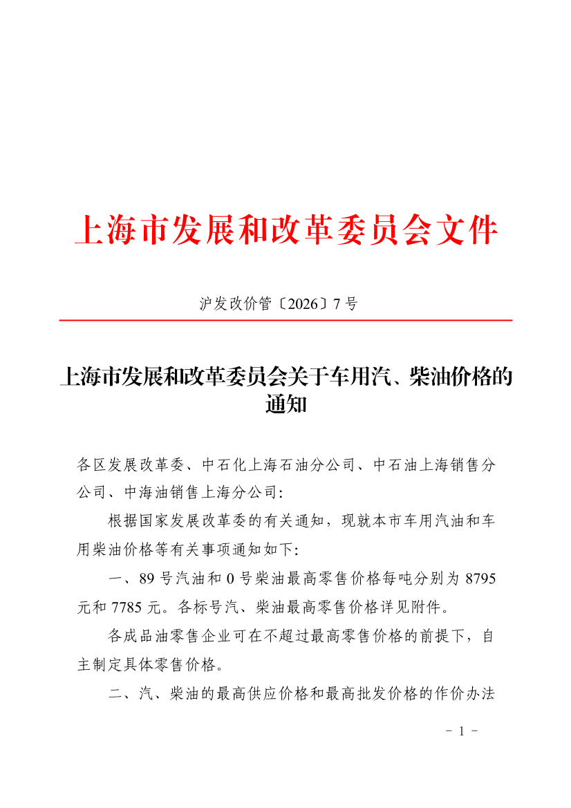上海市发展和改革委员会关于车用汽、柴油价格的通知(2026年2月24日) (发布日期:2026年02月24日 文号:沪发改价管〔2026〕7号)