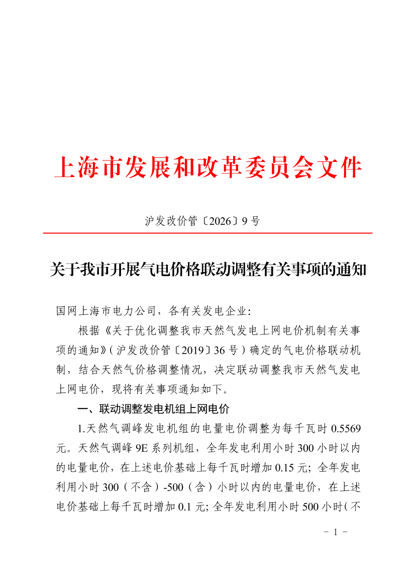 关于我市开展气电价格联动调整有关事项的通知 (发布日期:2026年02月26日 文号:沪发改价管〔2026〕9号)