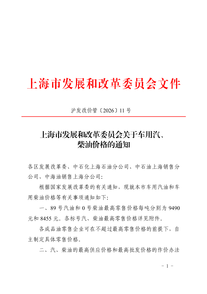 上海市发展和改革委员会关于车用汽、柴油价格的通知(2026年3月9日) (发布日期:2026年03月09日 文号:沪发改价管〔2026〕11号)