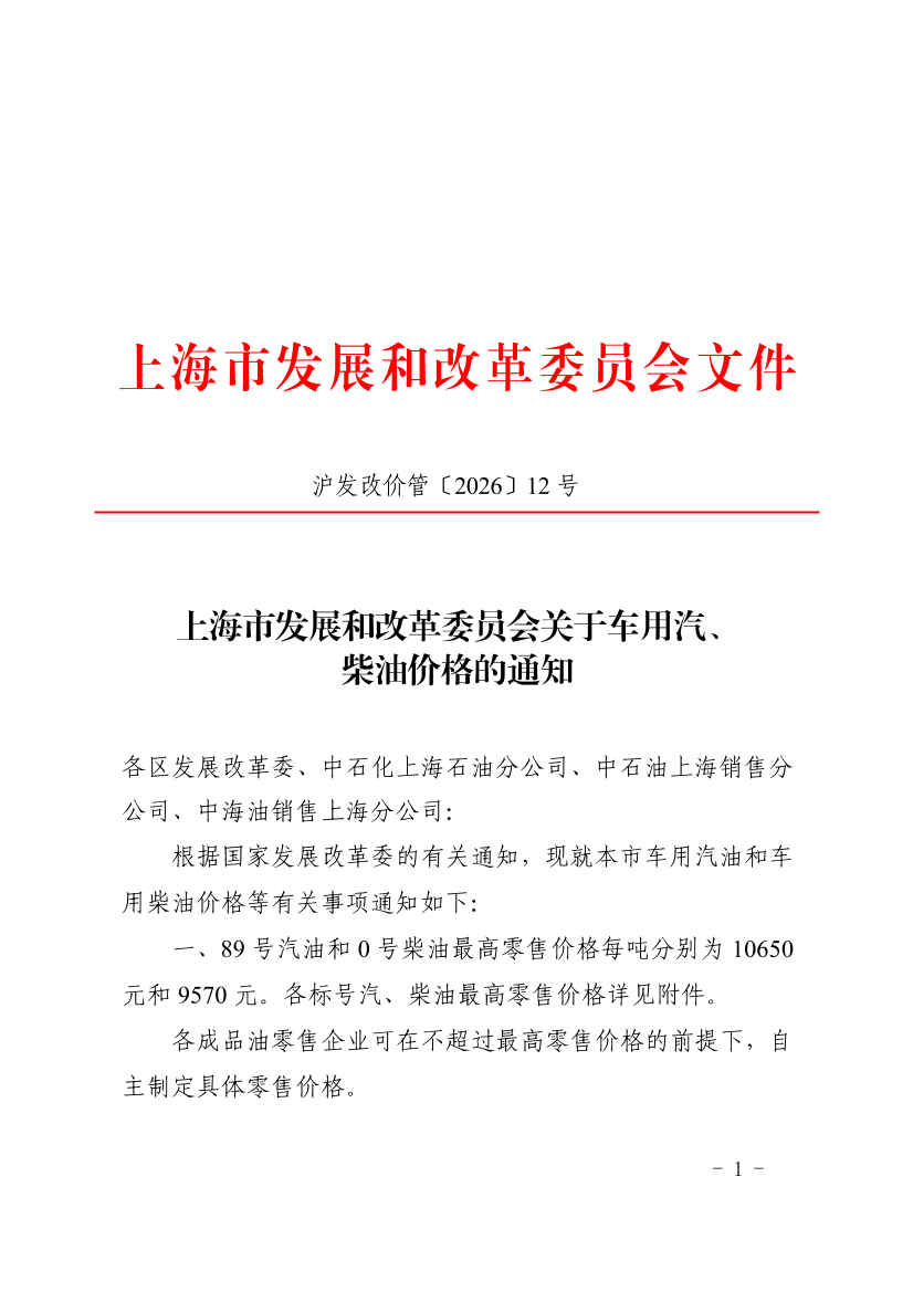 上海市发展和改革委员会关于车用汽、柴油价格的通知(2026年3月23日) (发布日期:2026年03月23日 文号:沪发改价管〔2026〕12号)