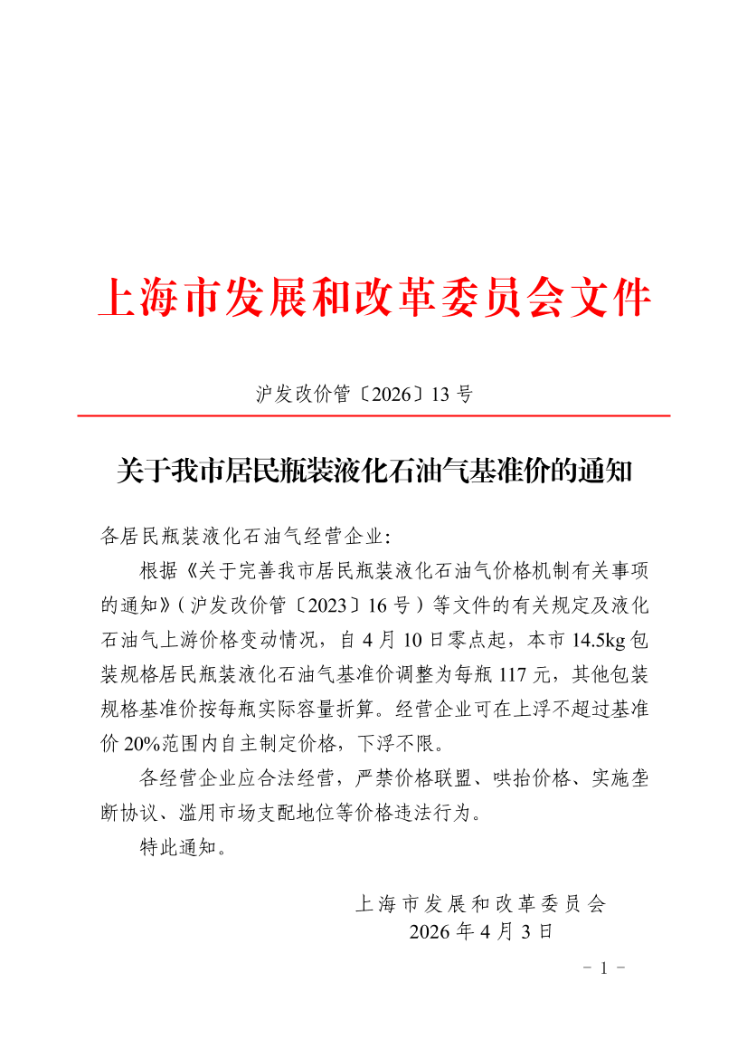 关于我市居民瓶装液化石油气基准价的通知 (发布日期:2026年04月03日 文号:沪发改价管〔2026〕13号)