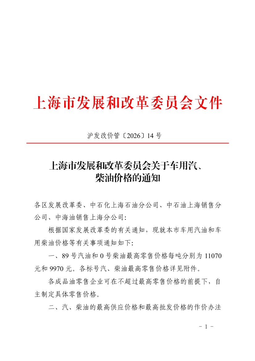 上海市发展和改革委员会关于车用汽、柴油价格的通知(2026年4月7日) (发布日期:2026年04月07日 文号:沪发改价管〔2026〕14号)