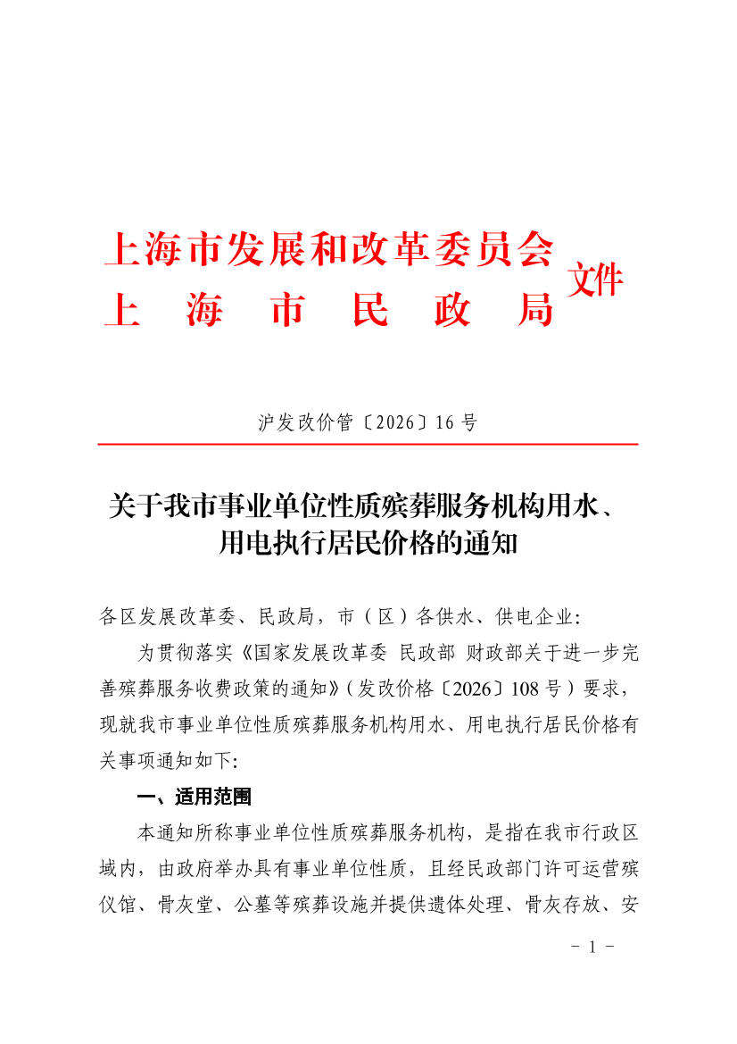 关于我市事业单位性质殡葬服务机构用水、用电执行居民价格的通知 (发布日期:2026年04月14日 文号:沪发改价管〔2026〕16号)