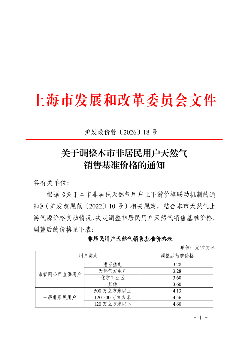 关于调整本市非居民用户天然气销售基准价格的通知 (发布日期:2026年04月23日 文号:沪发改价管〔2026〕18号)