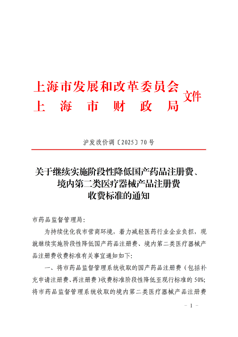 关于继续实施阶段性降低国产药品注册费、境内第二类医疗器械产品注册费收费标准的通知 (发布日期:2025年12月24日 文号:沪发改价调〔2025〕70号)