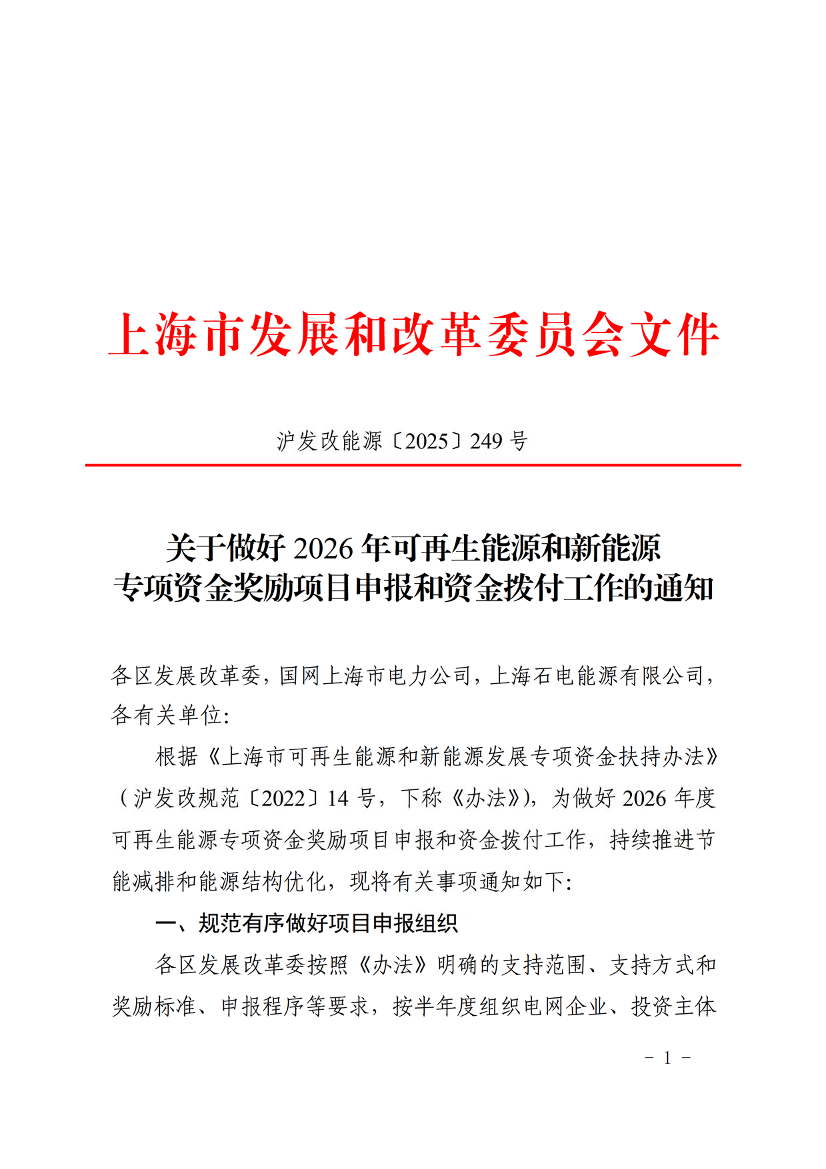 关于做好2026年可再生能源和新能源专项资金奖励项目申报和资金拨付工作的通知 (发布日期:2025年12月25日 文号:沪发改能源〔2025〕249号)