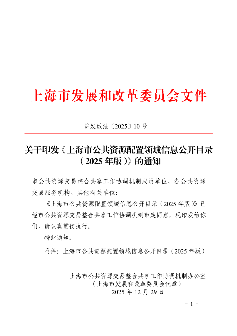 关于印发《上海市公共资源配置领域信息公开目录(2025年版)》的通知 (发布日期:2025年12月31日 文号:沪发改法〔2025〕10号)