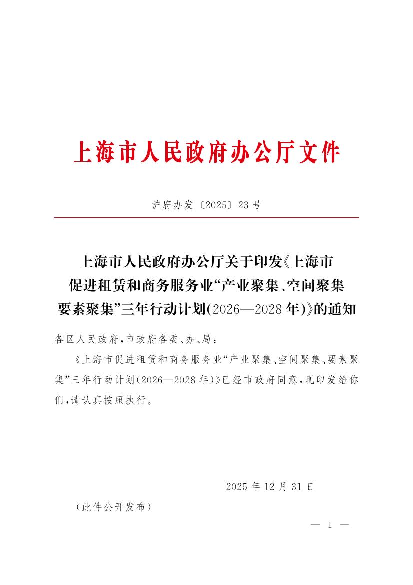 上海市人民政府办公厅关于印发《上海市促进租赁和商务服务业“产业聚集、空间聚集、要素聚集”三年行动计划(2026—2028年)》的通知 (发布日期:2026年01月09日 文号:沪府办发〔2025〕23号)