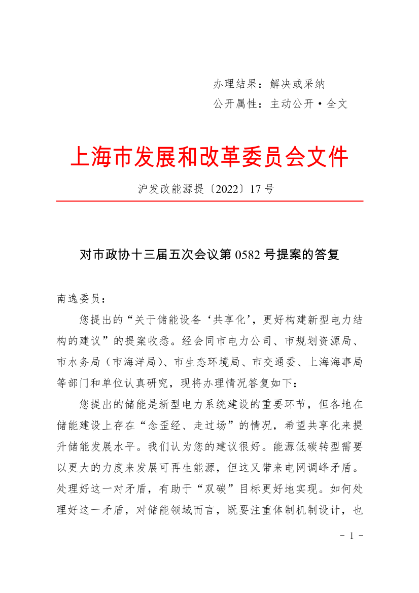 对市政协十三届五次会议第0582号提案的答复 (发布日期:2022年07月20日 文号:沪发改能源提〔2022〕17号)