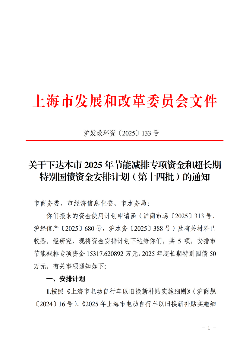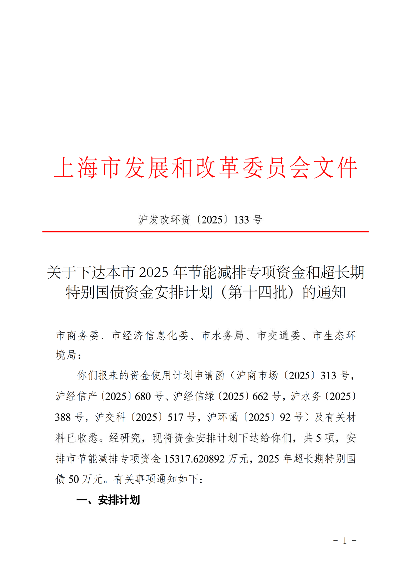 关于下达本市2025年节能减排专项资金和超长期特别国债资金安排计划(第十四批)的通知 (发布日期:2025年10月17日 文号:沪发改环资〔2025〕133号)