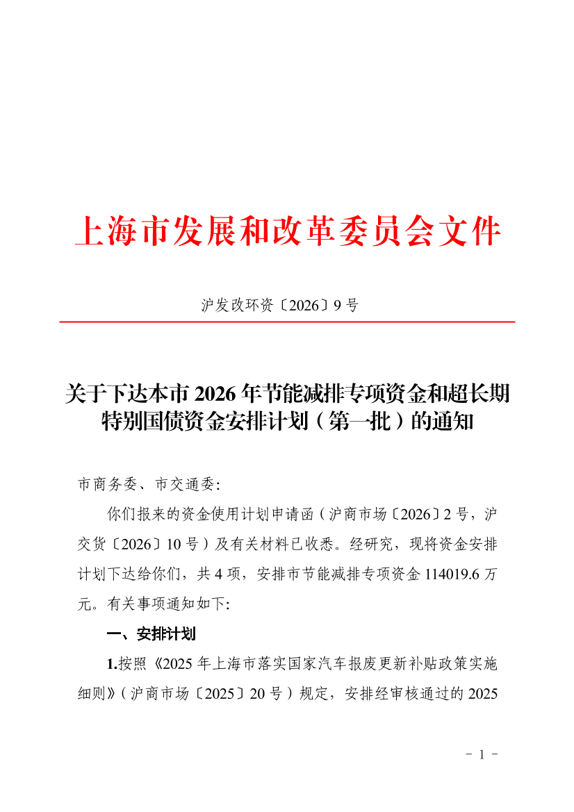 关于下达本市2026年节能减排专项资金和超长期特别国债资金安排计划(第一批)的通知 (发布日期:2026年01月15日 文号:沪发改环资〔2026〕9号)