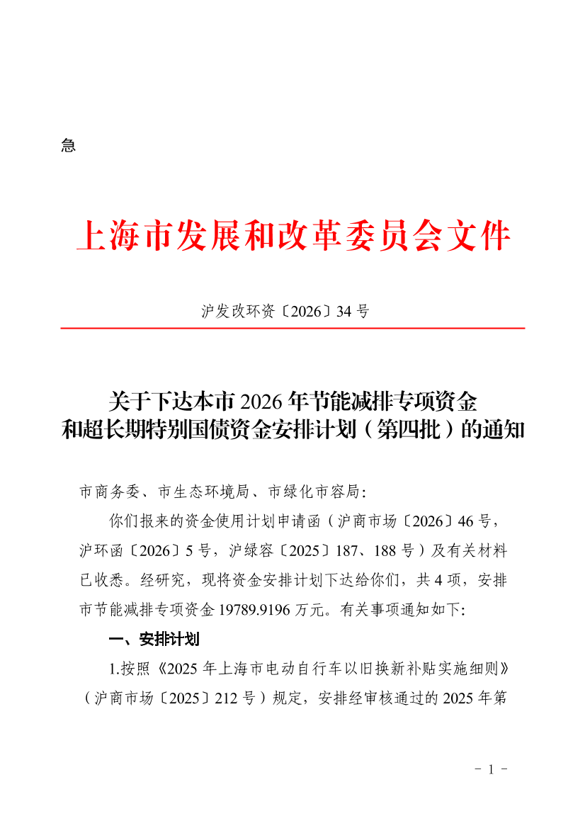 关于下达本市2026年节能减排专项资金和超长期特别国债资金安排计划(第四批)的通知 (发布日期:2026年03月12日 文号:沪发改环资〔2026〕34号)